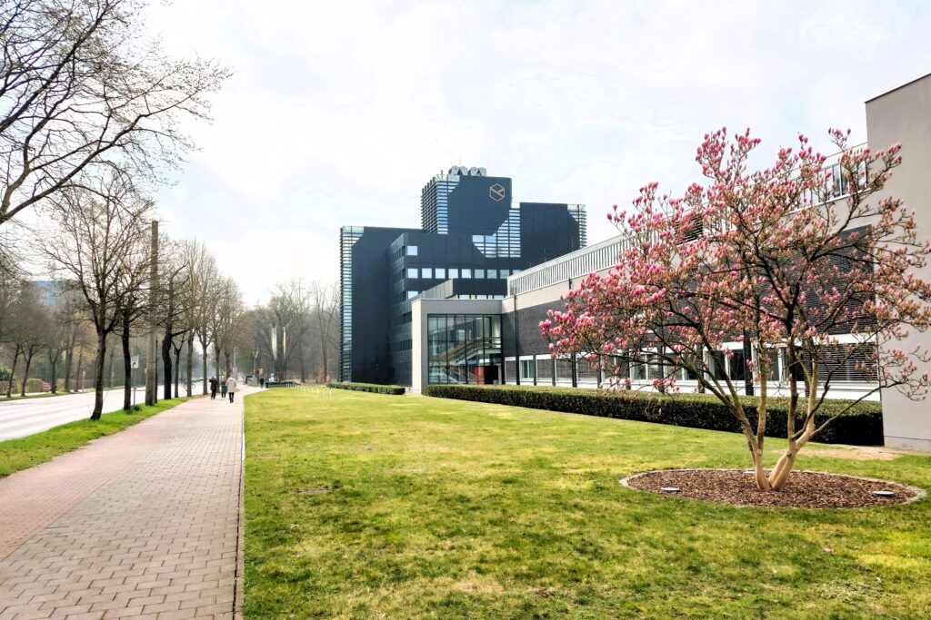 Die Zentrale von WestLotto in Münster. Rechts hinter dem blühenden Magnolienbaum ihr Veranstaltungszentrum, wo das HRCamp Münster 2025 stattfand. (Foto: Stefan Klemens)